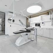 Pladsbesparende tandlægestol med loftmonteret unit.