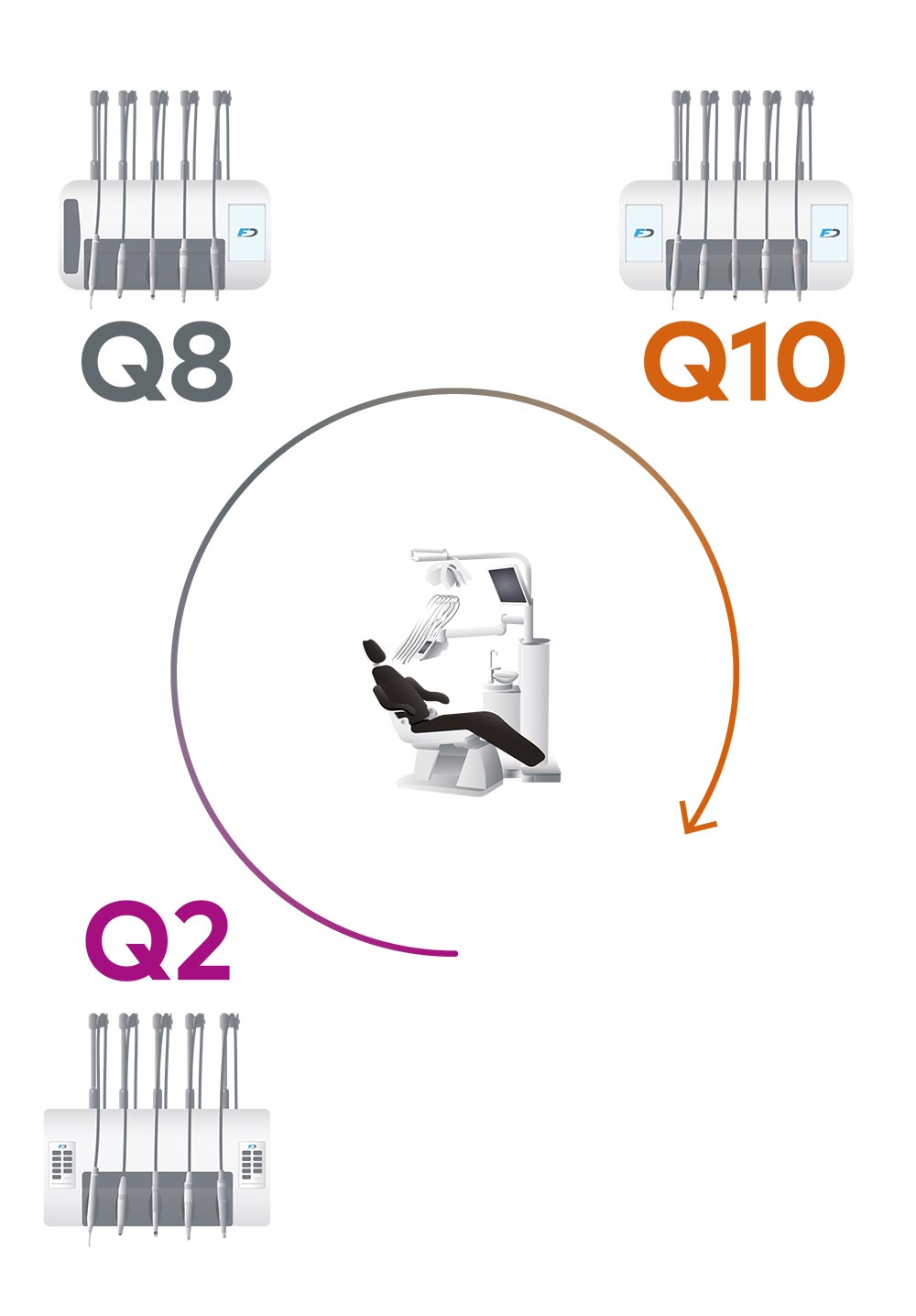 Q er en dental enhed, der er modul-opbygget, tilpasningsdygtig og kan opdateres og mødes med konstant udvikling fremtidens tandplejebehov.