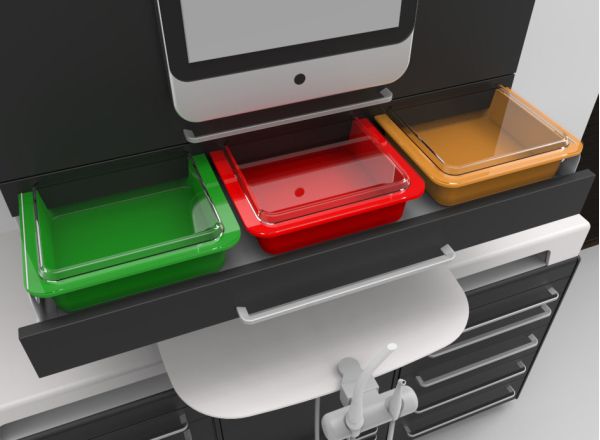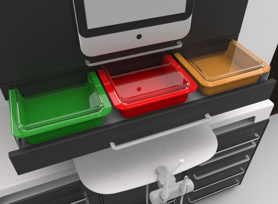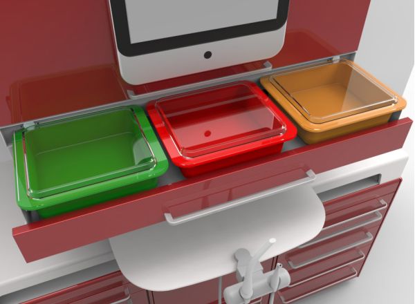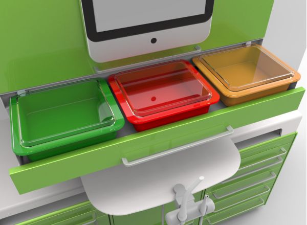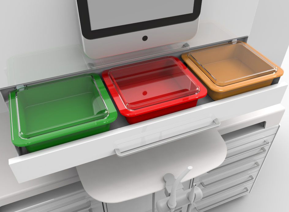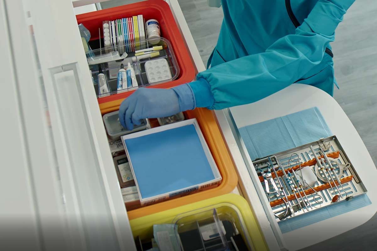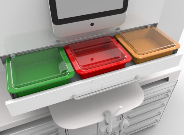 Med flexwall® opbevares forbrugsstofferne i den store nederste skuffe, hvor de til enhver tid er beskyttet mod miljøforurening.