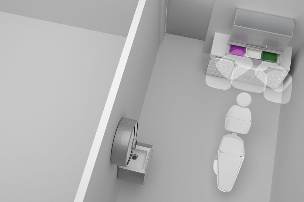 Systemet passer perfekt til vores tandlægestol fra Finndent som har loftmontere unit. Billedet illustrerer mere eller mindre hvor meget en Fenndent tandlægestol med logtmonteret unit fylder.