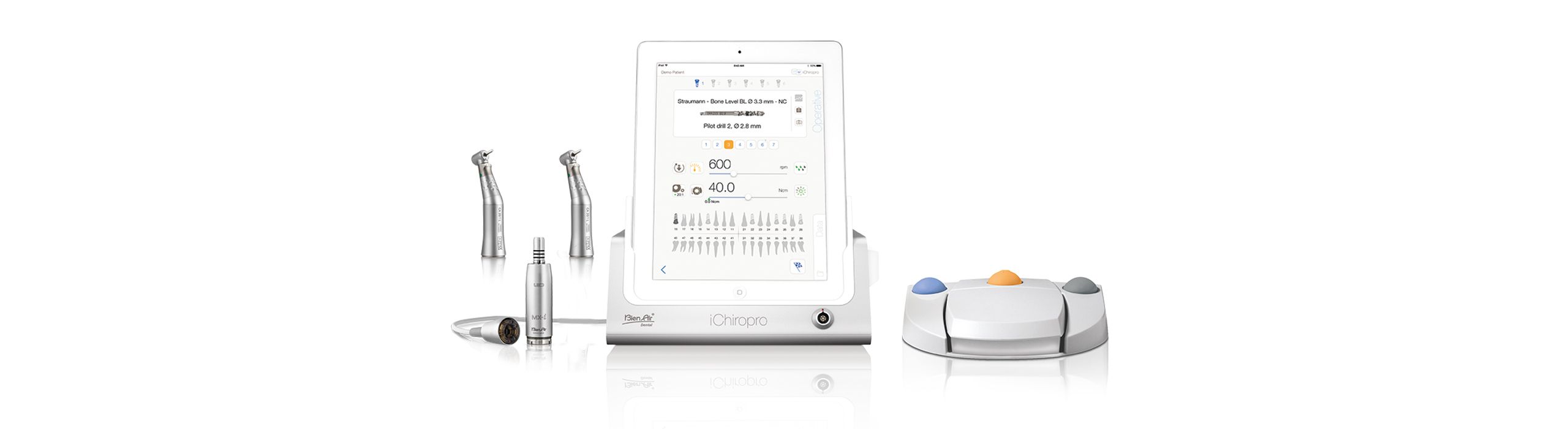 Den unikke og revolutionerende iChiropro er den perfekte partner til dine implantologi- og tandkirurgiske operationer. Styret af en iPad-applikation understøtter dette intuitive system dig i hvert trin af dine procedurer. Du skal blot vælge den forprogrammerede handling efter eget valg, og iChiropro vil give instruktioner og vejledning. For optimal patientfilanalyse og -styring kan applikationen bruges til at importere data fra coDiagnostiX TM softwaren, og du kan også gemme og eksportere dine operationsrapporter med et enkelt klik. Enkelhed, komfort og modernitet: Opdag en ny arbejdsfilosofi!