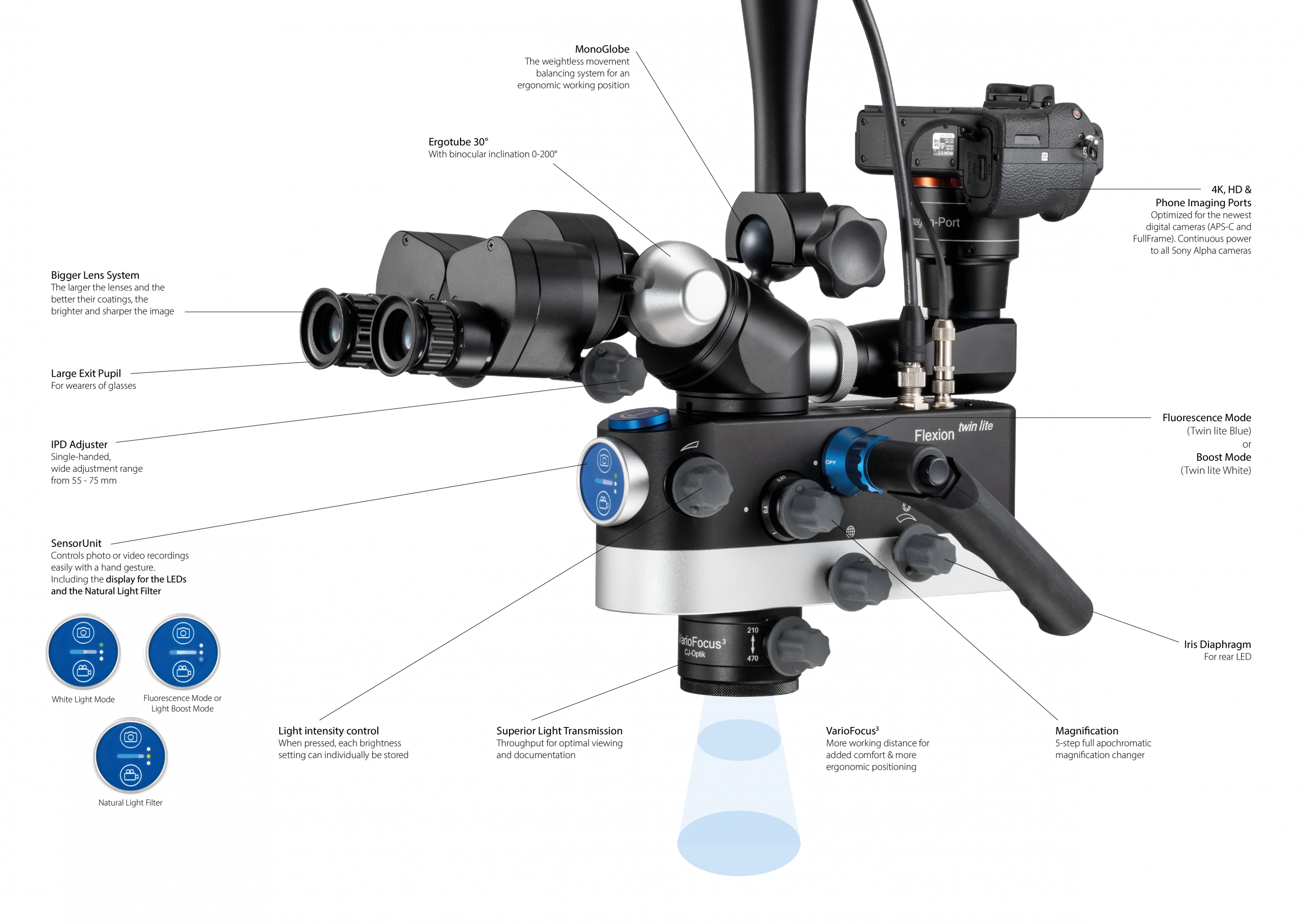 Her er vores nyeste medlem af Flexion-mikroskopfamilien. Ligesom de andre CJ- Optik dentalmikroskoper er den nye Twin lite designet og udviklet gennem et konsekvent fokus på tandlægernes behov. Ligesom med Twin er der to modeller at vælge imellem: fluorescensblå modellen eller lysmesteren White. Begge har det altafgørende Natural Light Filter, som forlænger forberedelsestiden for kompositmaterialer. Twin lite undværer bevidst det omfattende selektive filtersystem inklusive polarisationsfilteret fra dens store tvillingbror, hvilket gør den til et ideelt værktøj til almindelige tandlæger og tandplejere.